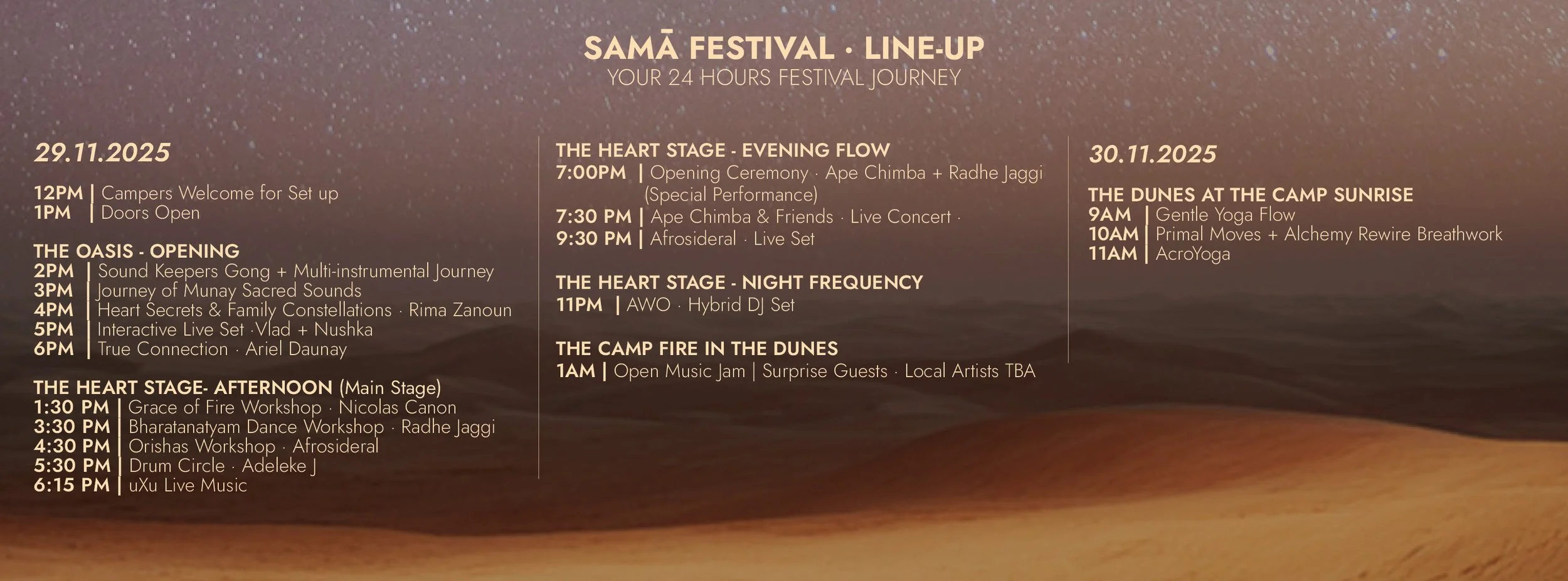 Let the rhythm guide you, the sunset inspire you, and the collective energy of the circle uplift your spirit as you prepare for the transformative experiences of the SAMĀ Festival.